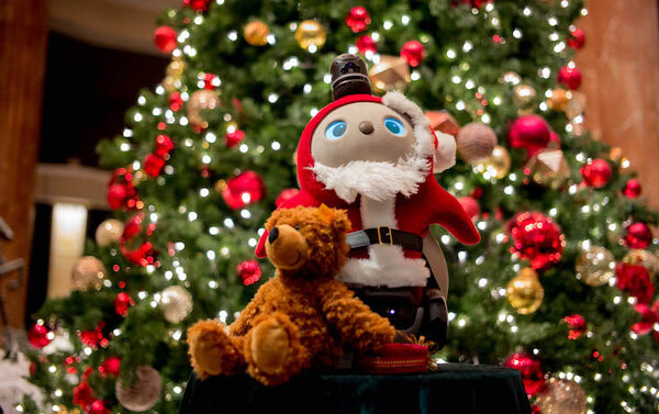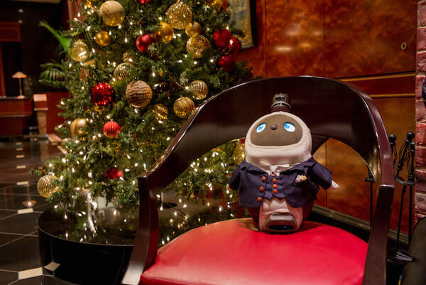 そのツリーの前にサンタクロースとトナカイのコスプレをしたLOVOTがいます。電源が入っているのでもぞもぞ動きます。かわいいです。これが最新鋭のロボットだということを知らない人も、興味津々な様子でLOVOTを見て、写真撮りまくっていました。宿泊者のほとんどの人がLOVOTを見ることになると思います、それほど目立ってました。