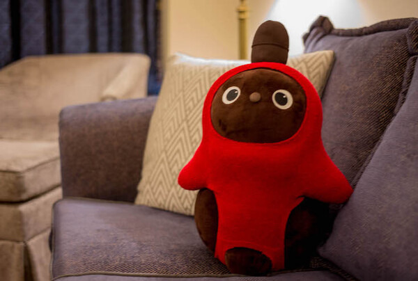 もう1体、ソファに赤い服を着たLOVOTがいますが、これはぬいぐるみ。ちょっと離れてみると本物のようです。