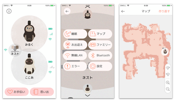 アプリはシンプルなので誰でもみればわかります。目の色を変えたり、声を変えたり、名前を変えたりといったことを設定できます。興味深いと思ったのはマップの表示機能で、LOVOTが動き回って地図を作成するものですが、すでにスイートルームのマップがかなり出来上がっていました。そしてかなり正確だったことにびっくりしました。