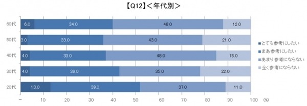 自分の「年齢」「性別」「購買履歴」などに合わせた情報は、商品購入のきっかけや参考になるかという質問については、商品購入の参考にしたいと回答した人が全体の約4割(41.6%)に上る結果となった。また年代別にみると20代の約半数近く(52.0%)が参考にしたいと回答しており、次いで30代(43.0%)、60代(40.0%)と20代が最もリコメンド情報の利用意向が高いことが分かった。