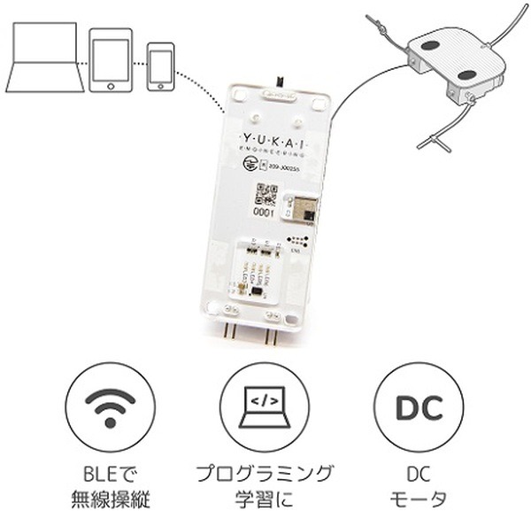 「ココロキット」は、小ワークショップでの活用や一般発売を含め販売数が1,500個を超えている「ユカイな生きものロボットキット」を、Bluetooth(BLE)を用いて無線で操縦することができるモジュールだ。自分で作ったロボットをScratchやJavaScriptで記述した自分のプログラムで動かすことができ、楽しくプログラミングを学ぶことができる。