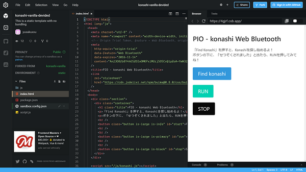 また、無料で使えるロボット制御用の専用プログラミング環境も同日より提供開始を予定している。同プログラミング環境はWebブラウザ上で動作し、専用アプリが不要。ココロキットとはBluetooth(BLE)で無線通信でき、PCだけでなくタブレット端末やスマートフォンでもプログラミング学習ができる。プログラミング言語はScratchとJavaScriptの2種類に対応、ユカイ工学が独自にカスタマイズしてロボット制御用の機能を追加している。