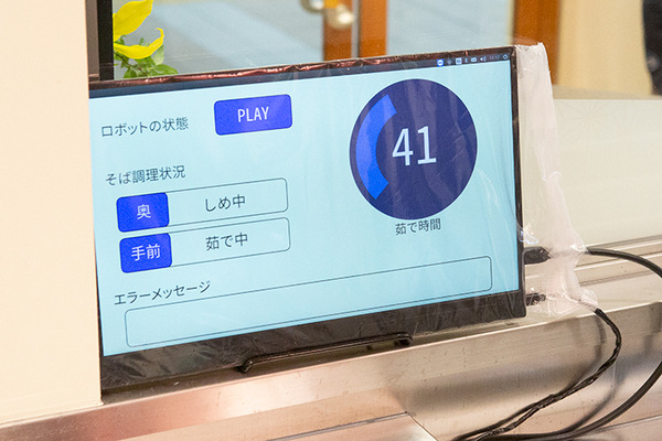 茹でる時間はお蕎麦の味や触感に影響するがロボットは正確だ。ディスプレイには残り時間や作業内容が表示され、スタッフが状況を把握しやすい。