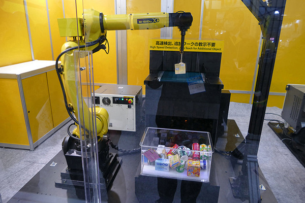 小物をピックする、ピッキング自体の自動化も進められている。ファナック株式会社は「袋物ワーク搬送システム」や、「小物ワーク取出しシステム」を出展していた。「小物ワーク取出しシステム」は高速検出が可能な3次元ビジョンセンサーと吸着するロボットアームを組み合わせたバラ積みピッキングシステムで、吸い付けやすい面をビジョンで見つけることで、対象ワークの形や種類などを事前教示する必要がなく、新しいワークを追加しても問題なく使える。