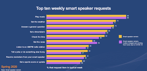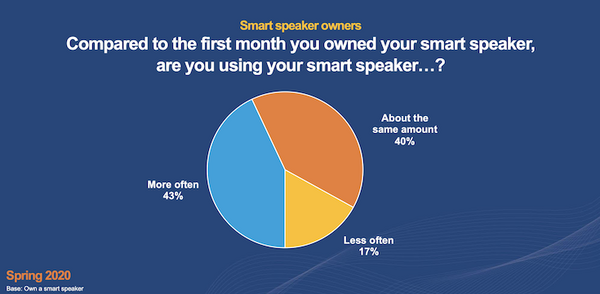 新型コロナウイルスの影響で35%が以前よりスマートスピーカーを使ってニュースや情報を聞くことが多くなったと回答した。