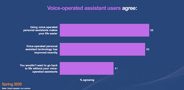 生活を楽にしてくれる 68%、音声アシスタントの技術は改善している 65%、音声アシスタントない生活には戻りたくない 41%となり、便利さが評価されている結果となった。