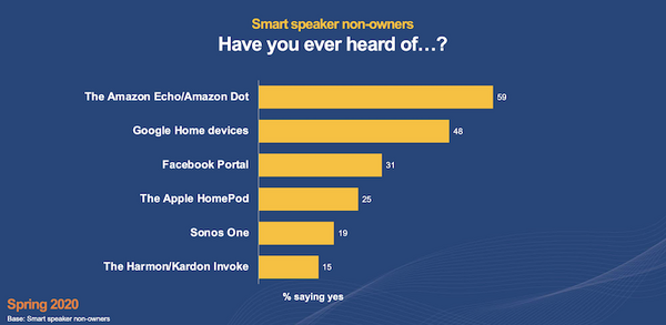 Amazon Echoが59%でトップ。ついでGoogle Home 48%、Facebook Portal 31%、Apple HomePod 25%と続いた。