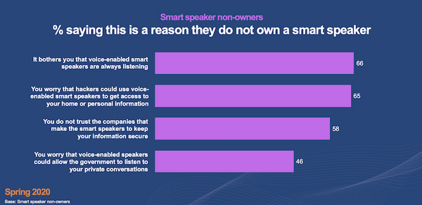 常時マイクONなのが気になる 66%、ハッキングのリスク 65%、スマートスピーカーメーカーを信用していない 58%、政府がプライベートな会話を傍受する懸念 46%と続いた。
