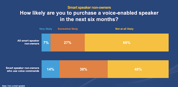 非所有者全体では34%が購入意向がある。中でも音声アシスタントを他のデバイスで使っている人は52%が購入意向がある。