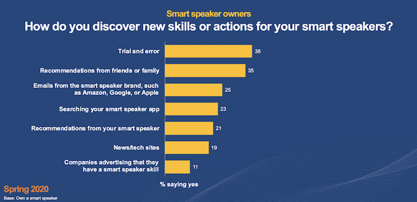 試行錯誤 38%、友人や家族からの推薦 35%、スマートスピーカーブランドからのメール 25%と続いた。