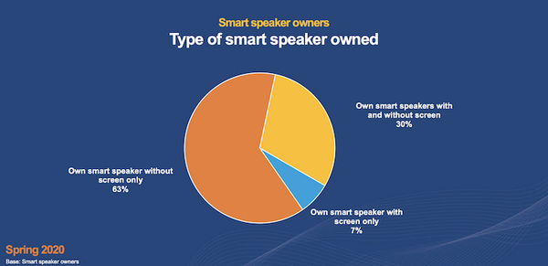 画面なしのスマートスピーカーのみ所有 63%、画面ありのスマートスピーカーを所有が37%。うち7%は画面ありのみを所有。