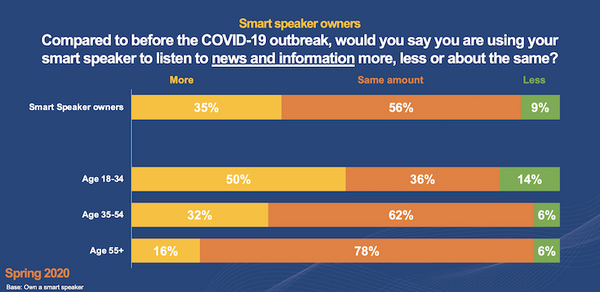 年齢別で見ると18~34歳では50%がよりニュースを聞くようになったと回答した。自宅での時間が伸びたことで、スマートスピーカーとの接点が広がったと考えられるだろう。