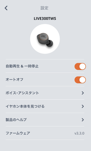 「My JBL Headphone」からは、トークスルー機能のオン/オフやタッチ等操作の設定、イコライザーの作成、イヤホン本体を見つける機能の利用などが可能。