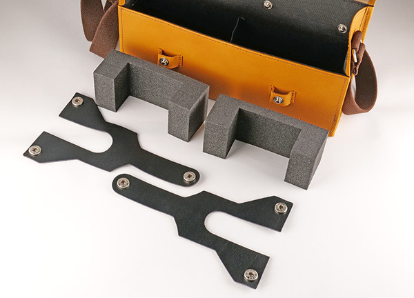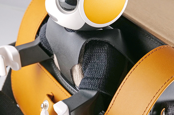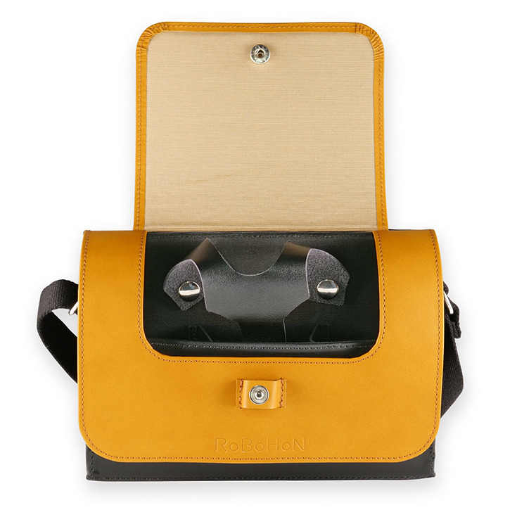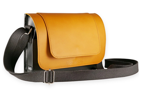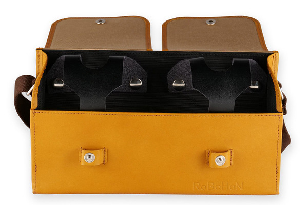 ポーチはロボホン1体用(シングル)と2体用(ダブル)の2種類。デザイン設計は国内外の高級ブランドなどの空間設計を手がけるインテリアデザイナー前田翼氏。国産の牛本革を選定し、鞄の生産量日本一の兵庫県豊岡市にある高級ブランドのバッグ製造を行う縫製工場と提携したMade in Japanのロボット用お出かけポーチとなっている。