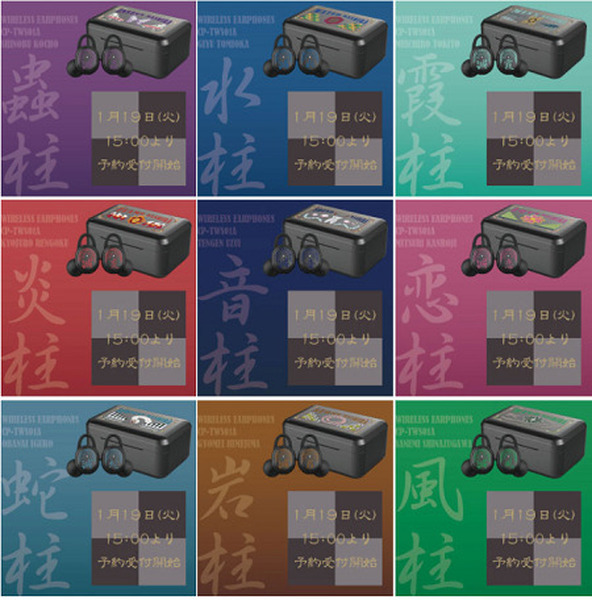 オンキヨーホームエンターテイメント株式会社の子会社であるオンキヨー株式会社は、オーディオ・アクセサリーブランド『武蔵野レーベル』を運営する株式会社カンパーニュとの共同プロジェクトとして、日本初上陸の「CP-TWS01A」と、TVアニメ 『鬼滅の刃』とのコラボレーション第二弾完全ワイヤレスイヤホン~柱デザイン~の予約販売受付を2021年1月19日より開始する。販売価格は15,000円(税込・送料込)。予定台数に到達次第予約受付終了となっている。