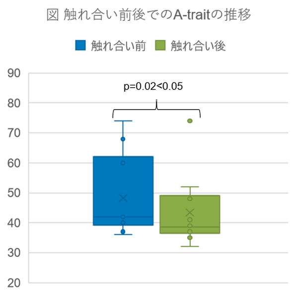 『LOVOT』オーナーにおいて、15分という短時間の『LOVOT』とのコミュニケーションによって各種ストレスが減少し、特にA-trait(特性不安)という「ふだん一般、どのように感じているか」を指す不安体験に対する比較的安定した反応傾向が著しく低下した。