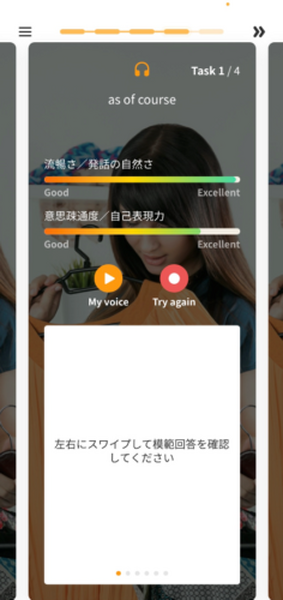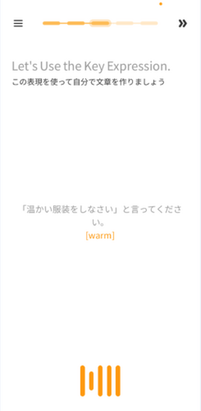 自分の発話を文章にしてくれるので、視覚的に確認できるのがよい。回答例が1つではなくいくつか提示してくれるので、学習しやすい。スマホで手軽にできるので、初級から順番に進めている。
