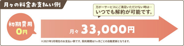 | 金額 | 初期費用0円、月々33,000 円(税込み) ※契約期間は1か月ごとの自動更新 |