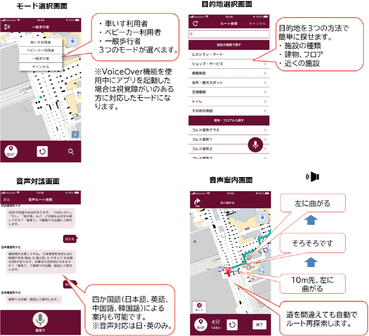 清水建設と日本IBMの共同開発による屋内外音声ナビゲーション・システムと、IBM Watsonの対話機能が連携。AIを駆使した高精度のナビゲーションを実現した。車いす利用者にはエレベーターでのルートを案内する等、利用者に応じて目的地までの最適ルートをアプリで案内。高い測位精度をもとに、地図、音声、またはスマートフォンの振動を通じてスムーズに誘導する。また、多機能トイレ位置、エレベーターのボタン位置、店舗情報など利用者のニーズに配慮した詳細案内を用意。4か国語(日、英、中、韓)による案内(音声案内は日英のみ対応)や自動ルート再探索機能を搭載した。