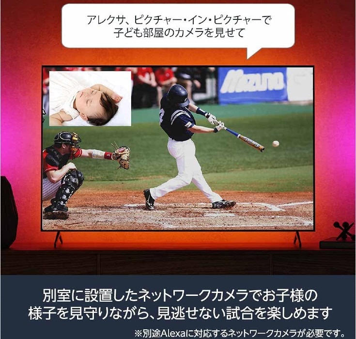 ピクチャー・イン・ピクチャー機能を使って、別室に設置したネットワークカメラでお子様の様子を見守りながら、見逃せない試合を楽しめるむなど、スマートホーム機器をより便利に活用できる(Alexa対応のネットワークカメラ(別売)と事前の設定が必要)。Alexaに天気を尋ねたり、照明を暗くすることも可能だ。