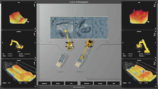 自律運転はダンプトラックの運転手が現場に備えつけたボタンを押すことで開始され、一定量の積み込みが完了すると自動で停止するため、人手による作業が発生しない。自律運転中、オペレータは遠隔地に設置したモニターで施工ヤード各所に配置した複数台のカメラからの俯瞰映像や、バックホウの姿勢や状態、掘削エリアとダンプトラックへ積み込んだ土砂形状などのセンシング情報をリアルタイムで監視する。加えて、遠隔操縦に切り替えることで、オペレータは現場のカメラ映像や作業音などをもとにバックホウを操作できる。1人のオペレータが複数台のバックホウを同時に監視することで、省人化を実現した。