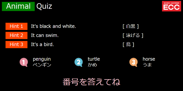 クイズは「Animal Quiz」「Food Quiz」を搭載。Alexaから英語で出される3つのヒントを聞いて、何の英単語のことかを当てる。想像力を働かせながら、親子で楽しく挑戦できる。問題文、選択肢は英語と日本語の両方で表示され、クイズを通じて「英単語」と「英単語を説明する英語表現」を学習することができる。回答は「いちばん(1番)」というように日本語で番号を答えるため、英語の発音に自信がないという人もクイズを楽しむことが可能。