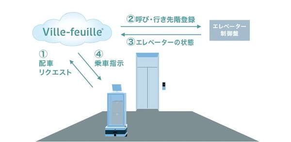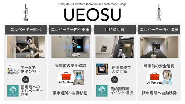 UEOSUは、ロボットのフロア移動を体系的に実現するテクノロジー群だ。今回のアップデートにより、ロボットが安全かつ自動でフロア移動を行うための機能を追加している。また、同ロボットにビルトインされているシンプルなAIコマンドセット「AI Toolbox」を活用し、ロボットがエレベーターを乗降車する際に乗降車場所に人や物がないかどうか安全確認を行うことで、ロボットの安全なフロア移動をサポートする。また、「Ville-feuille」に対応することで、「Ville-feuille」が導入されているビルであれば、エレベーターの呼び出しから乗降車まで一貫してビル設備とシステム連携することで、ロボットのフロア移動をスムーズに自動化することが可能となる。