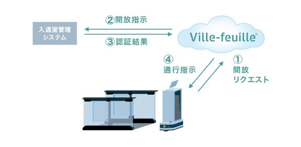 ロボットがセキュリティーゲートや自動ドアを通過する際に、入退室管理システムにロボットのIDを渡して通行権限を認証させ、ゲートの開放や扉の解錠、ロボットへの通行タイミングなどの指示を行うことで、ロボットのセキュリティーエリアを跨いだ自律移動を実現。なお、「アーバンネット名古屋ネクスタビル」は同機能の初導入であり、ugoが初対応となっている。