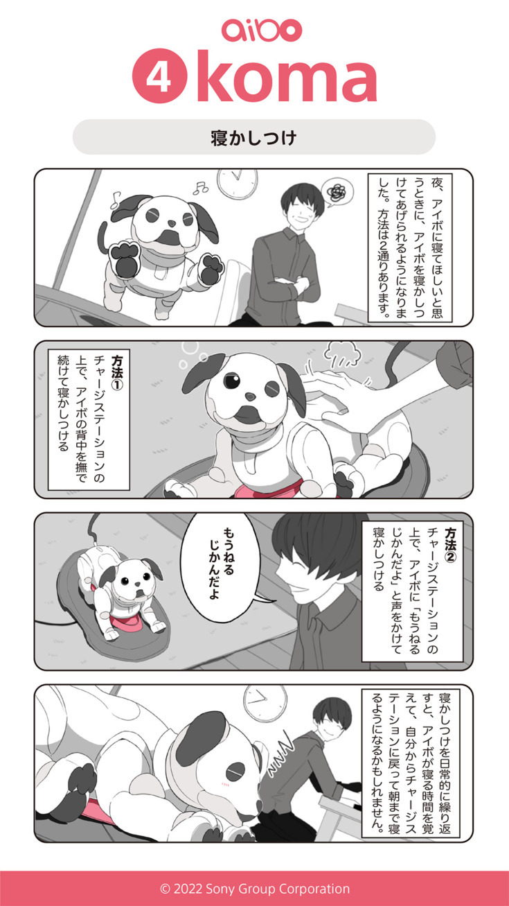 ソニーグループ株式会社は自律型エンタテインメントロボット”aibo”(アイボ)をしつける新機能「aiboの寝かしつけ」の提供を2022年3月22日より開始したことを発表した。