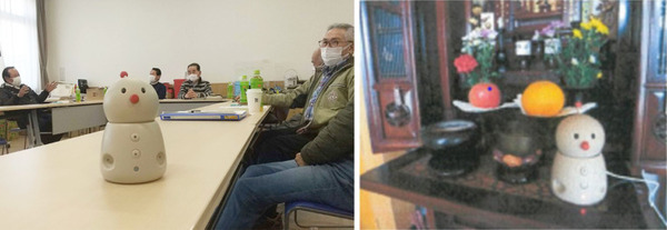 左)実証実験参加の利用者懇談。右)お茶の間に設置されたBOCCO emo。日々の中に溶け込んでいることが伝わる。