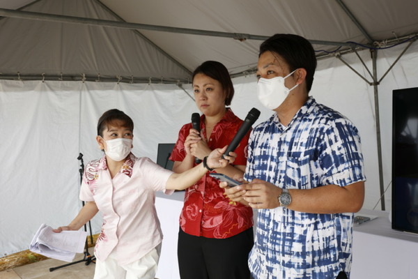 イベント第一部ではNTTドコモ坂本秀治部長と沢野綾子氏、任意ボランティア団体「ゴミがすべての始まりだった。」(通称:gomisube.)友寄隆秀氏が登壇し、イベント概要や取り組みの経緯、沖縄の海の現状や課題について説明した。