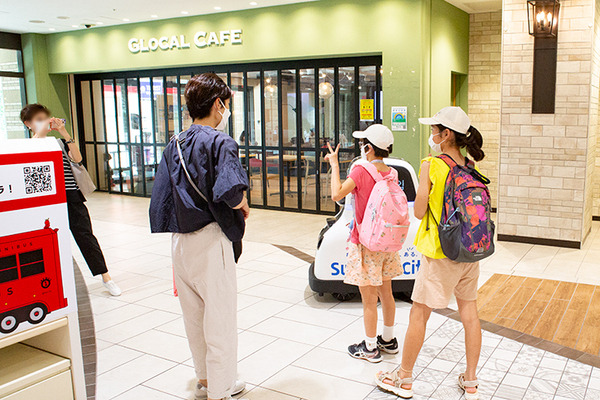 商用エリアにはたくさんの来店客がいるが、もちろんぶつかる様子もなくスムーズに移動する。周囲の来店客も注目して、ロボットに話しかけたり、写真を撮ったりしていた。
