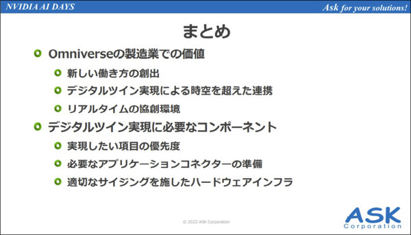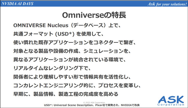 初日の23日、株式会社アスクは「NVIDIA Omniverseによって実現するパラダイムシフト」と題して、今注目のデジタルツインやそれを実現するプラットフォーム「NVIDIA Omniverse」(オムニバース)について公演した。