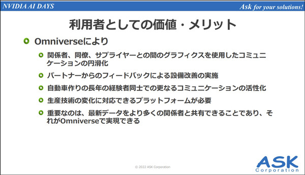 ASKではOmniverseデジタルツインの構築を請け負っているという。最近では「BMWと同じようなデジタルツイン工場を構築したい」という要望が増えているという。