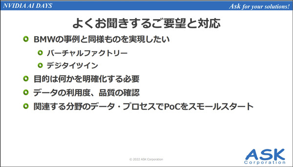 そこでは、衝撃的だったBMWのバーチャルファクトリーを構築し、デジタルツインを実現する具体的な方法も解説された。ASKには「BMWと同じようなデジタルツイン工場を構築したい」という問合わせがきているという。