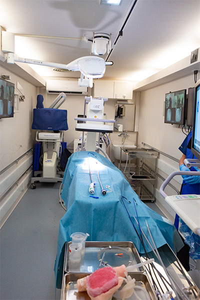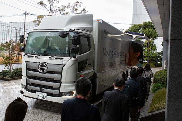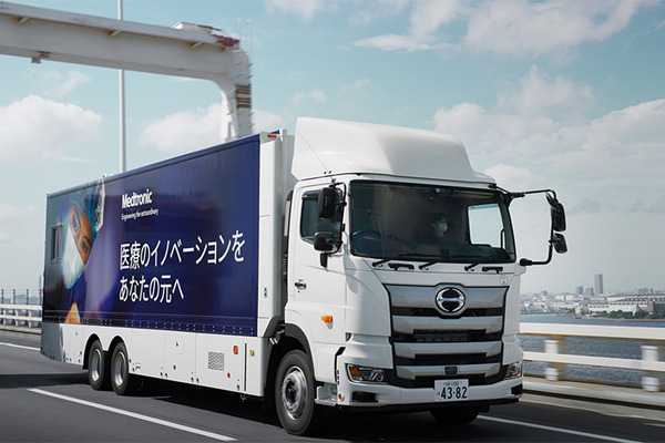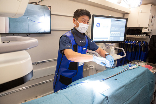 「Mobile Training Lab」は、ペースメーカーの植え込みや脊椎の手術、不整脈の治療などのトレーニングを行うことができる移動型の施設だ。形状は大型トラックで、中には手術室を模した研修室になっていて、通信設備を備え、映像を見たり会話をしたりしながら実際の手術のシミュレーション体験ができる。