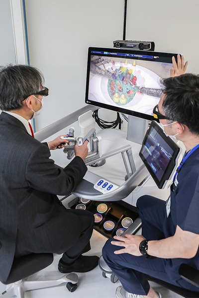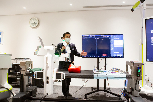 体験会では、2022年12月に発表した手術支援ロボットシステム「Hugo」を報道陣ひとりずつが操作体験した。また、移動式トレーニング施設「Mobile Training Lab」トラック、MR(複合現実)技術「HoloMe」トレーニングシステム、CTから臓器や血管などの3D画像を生成する症例支援プラットフォーム「d-Case MASTER」、脊椎手術支援ロボットを展示。報道関係者に向けて詳細な紹介が行われ、一部の機器については同様に操作体験も実施した。