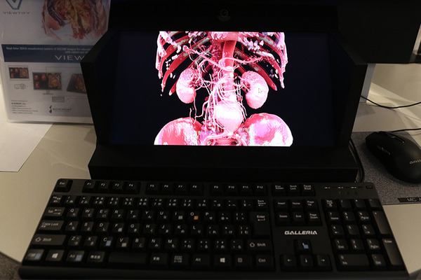 CT画像から、グリグリと回して視られる立体画像を生成する症例支援プラットフォーム「d-Case MASTER」。搭載している3D化アプリケーションのViewtifyは株式会社サイアメントが、使用している3DCGの空間再現ディスプレイはソニー株式会社が開発したもの。