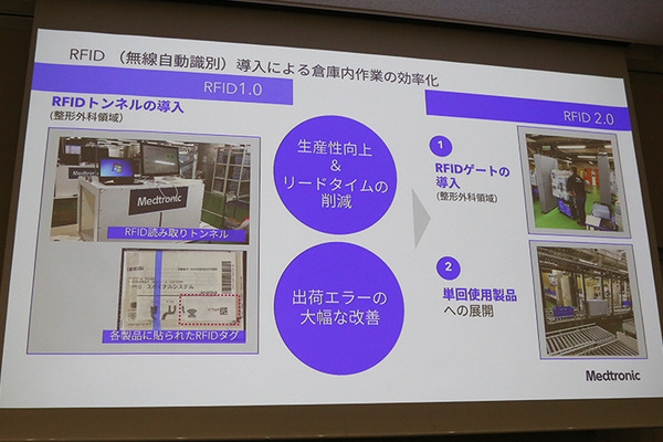 日本メドトロニックは3つの取り組みとして「医療現場を支える物流」「デジタルヘルス」「イノベーションにおける国内連携」を掲げた。いきなり物流の話で面食らったが、実際の医療現場ではひとつの手術あたり膨大な器具や薬剤を出荷しているという。更に使用しなかった器具や薬剤は返却され、その膨大な量の出入荷を確実に行うためにRFIDなどの最新技術を導入して生産性の向上とリードタイムの削減につとめているとした。