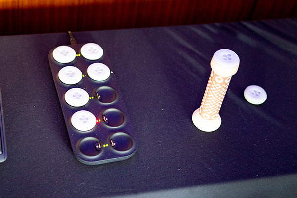 「Miroki」にはユニークな機能がある。モンソー氏が「魔導石」(ルーンストーン)と呼ぶボタン型の「Miroki」とBluetoothで通信するツールだ。魔導石を装着したスティック型のツールも用意される。