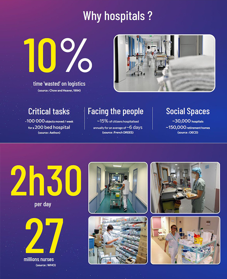 モンソー氏は、「病院では看護士などが、物を運んだり移動するのに労働時間の約10%を費やしています。200床程度の病院では毎週、10万回以上の物の移動や運ぶ作業が発生しています。ホテルやレストランなど含めてソーシャル・ロジスティクス、物を運ぶ作業は様々な分野で必要されていると考えています」と語った。