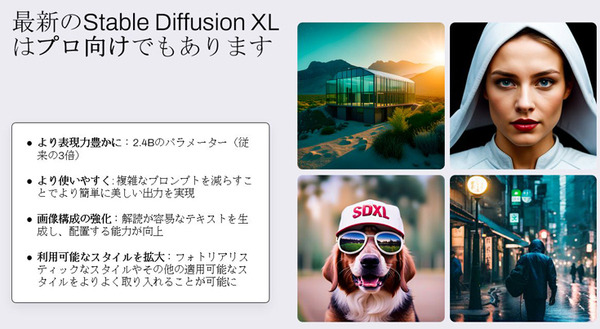 「Stable Diffusion」は画像生成AIの先がけであり、進化も著しく、最新版の「Stable Diffusion XL」は、従来の3倍にあたる24億パラメーターを学習し、表現力が豊かになり、複雑なプロンプトを減らし、簡単な表現でもユーザーが望むアウトプットが実現しやすくなった。更にはフォトリアリスティックな表現も生成できるようになった。