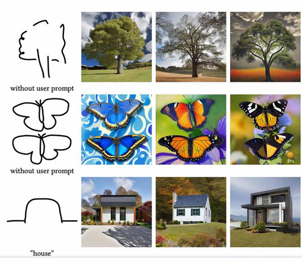 こんな木、こんなチョウチョ2匹、こんな家、といった線画から綺麗な画像を生成して提案