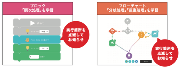 一連の作業を通してプログラミングも学ぶことができ、プログラムをフローチャート形式で組むことができるため、if文やfor文など、より高度なプログラミング要素も直感的に身に付けることが可能となっている。