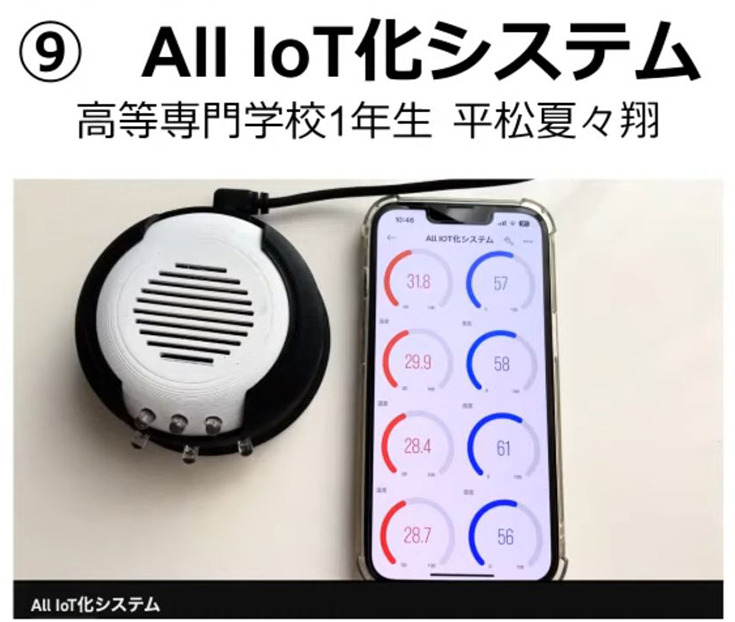 優秀賞の「高等学校」部門は、高専1年生の平松夏々翔さんの「All IoT化システム」が受賞した。いわゆるスマホアプリでスマートホーム向け家電を操作するリモコン分野の作品だが、平松さんは受信デバイス(ハードウェア)、制御ソフト、スマホアプリのすべてを開発した。