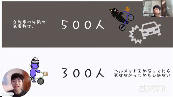 川口聡介さん(小5)の作品で「ニャメット」です。自転車に乗っている人がヘルメットを着用している割合がわずか11.2%、ヘルメットを被っていた場合の事故による死亡率の変化に着目し、自転車用ヘルメットを被りたくなるようなアプリとヘルメットを開発しました。