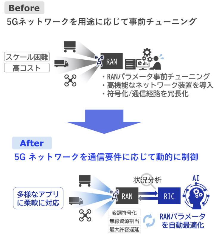 これに対し従来は、高機能なネットワーク装置を導入し、周波数資源を十分に用意して符号化や通信経路の冗長性を高め、RANパラメータを用途に応じて事前チューニングするなどして安定した通信環境を実現していた。しかし、これらの方法ではDXの進展で多様化するアプリケーションに広く対応することが難しく、導入に時間・コストを要することも課題となる。