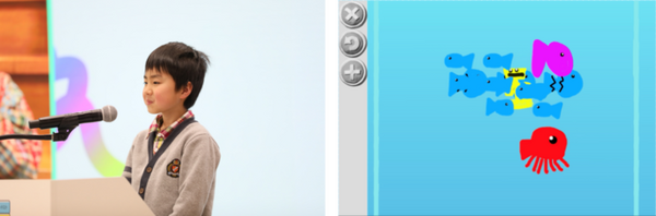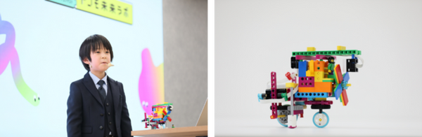 「僕はお魚が大好きです。だから、人もロボットも魚も、みんなが平和になるような未来のマシーンを作りました。お魚が上に動いたり、下に動いたりさせるのが難しかったけど、あきらめずに頑張りました。」
