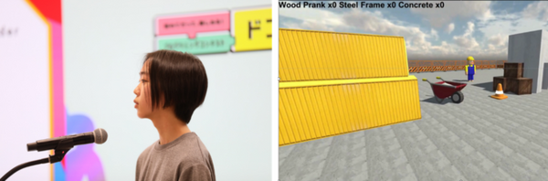 「未来の建設現場を作りました。資材はゴミをリサイクルして作ります。また建物は上空に浮いているため、騒音問題もありません。そういった未来の建設現場をゲームで体験できるようにしました。オブジェクトはすべて自作し、見た目の自然さやゲームとしてもちゃんと機能するかなど、細部までこだわりました。」