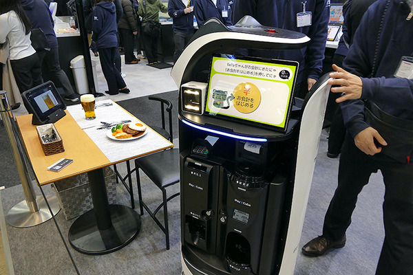 POSなどで知られる東芝テックは飲食店向けソリューションとして、ネコ型配膳ロボットで現金決済を行うソリューションを出展。最近の一部ファミレスでは、キャッシュレス決済についてはテーブル上でできるようになっている。だが現金に関してはレジで決済を行う必要がある。